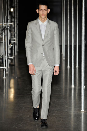 Bastian opened the show with a signature Dean look: jeans, a white T-shirt, penny loafers, and a red windbreaker, transitioning to a more tailored look.