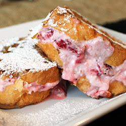 To prepare the toast, carefully slice a pocket into the center of each slice of bread, taking care not to cut all the way through to the other side. Heat a large skillet over medium heat. In a shallow baking dish or pie plate, whisk together the egg and milk. Whisk in the melted butter and vanilla. Stir in the flour, cinnamon and salt and whisk until smooth. Fill the pocket of each slice of bread with some of the filling mixture. One or two at a time, place the filled slices of bread in the egg mixture, soaking about 30-40 seconds per side. Remove the bread and allow the excess batter to drip off. Transfer to a plate and repeat with the remaining bread slices.