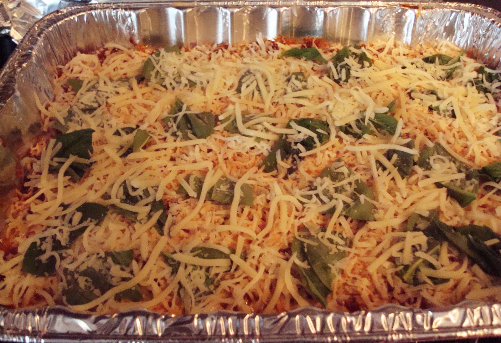 Then just start building. Noodles that cover the bottom of the pan, meat sauce mixture, ricotta mixture, mozzarella cheese, few fresh basil leave. Repeat. I was able to build 3 layers.