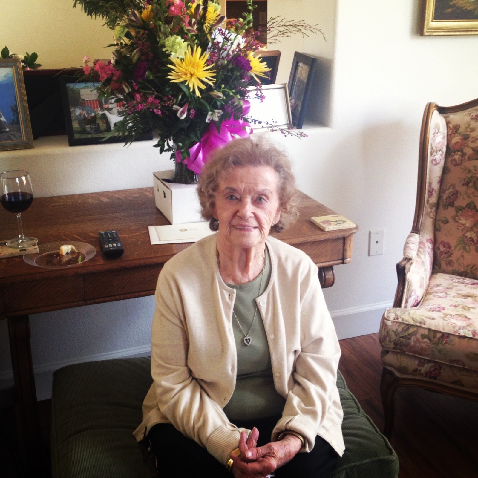 Surprisingly to many, she is still living on her own in a house and takes complete and full care of herself. She has 100% of her wits about her and her stubbornness is non-comparable. She had no intentions of moving into an assisted home and her pleasures of life is a nice glass of red wine and having dinner with her girlfriends – the same pleasures that I enjoy at 34-years-old.