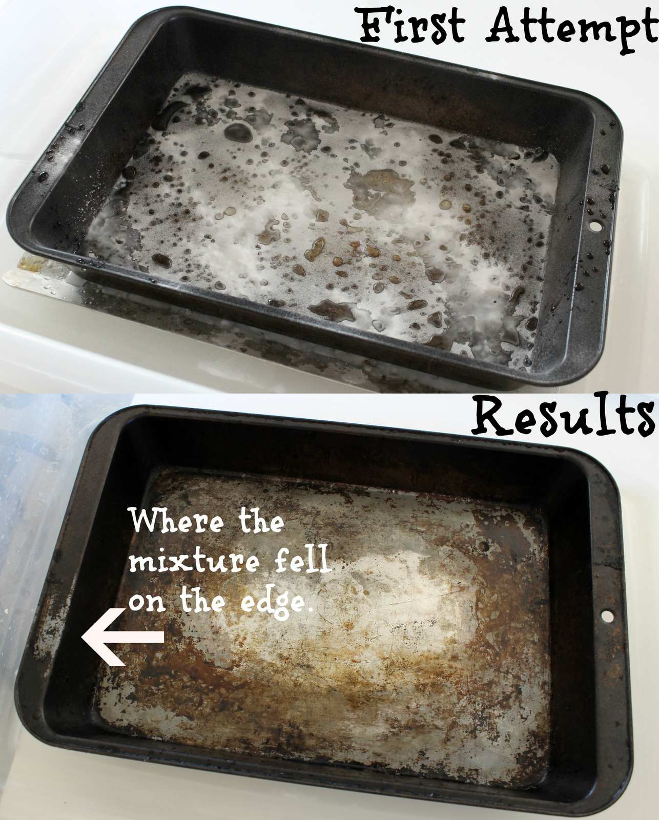 I am more than pleased with the results. It did take me a few tries, and turned my sink into what looked like a science experiment, but it was absolutely worth it. My husband could not believe the difference either. It looks and feels almost like a brand new pan. I could probably do one more soak to get rid of the stubborn marks in the corner, but for what I have done, I am really impressed. Especially for what it looked like in the beginning. I am sure if your pan was not as bad as mine, it could get sparkling sooner and easier.