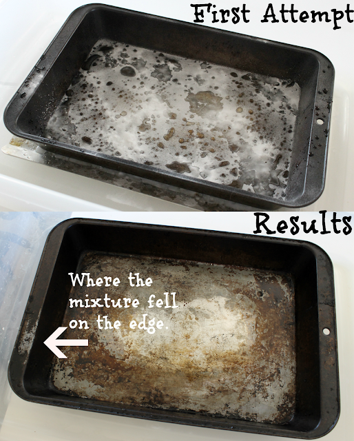 As you can see. This was my first attempt and I guess I really didn’t “get” how much of the baking soda and the peroxide to put on. I was pleased to see that by just spinkling some peroxide and baking soda did make a difference. You can see that just a little baking soda and peroxide made it on the end of the pan and it worked to remove some of the baked on gunk.