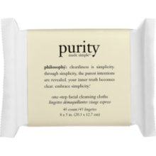 Philosophy Purity Made Simple One-Step Facial Cleansing Cloths. These wipes are propylene-glycol-free so they will not irritate even the most sensitive skin or around the eyes. They do not need water and will remove make-up and all skin impurities. Can be found at Philosophy.com for $20.00. 45 wipes.