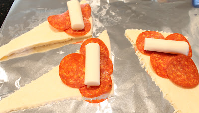 Pre-heat oven to 375 degrees. Roll out the crescent rolls and place 3 – 4 pepperoni slices at the wide end. Cut the string cheese in half to make 8 pieces and place one piece on top of the pepperoni. Roll and fold the ends so that the cheese will not melt out during cooking.