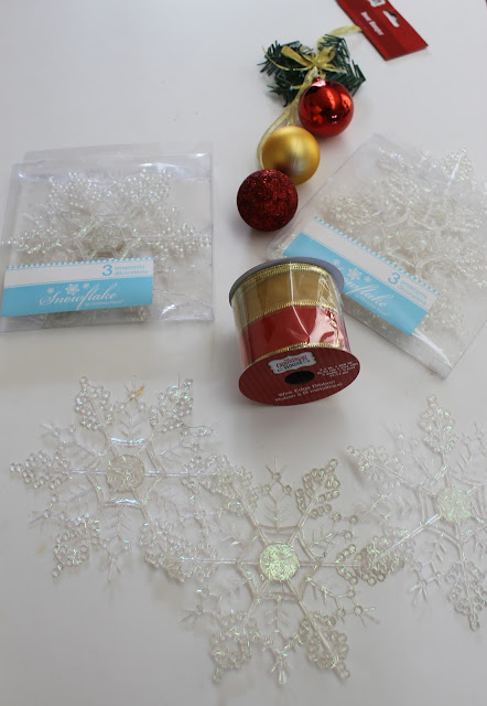 As I was perusing the holiday decorations and party section, I noticed that there were some plastic snowflake ornaments. I had the idea that I could glue them together and make a cute and unique wreath. I have been meaning to make it to the craft store to make my own wreath, but I didn’t know what I wanted to make. I knew this would be totally different and I think kinda cute. Besides, I figured since I’m in Phoenix, I need a few snowflakes.