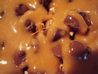 After brownies are baked pour remainder of caramel sauce on top and sprinkle with remainder chocolate chips.