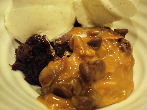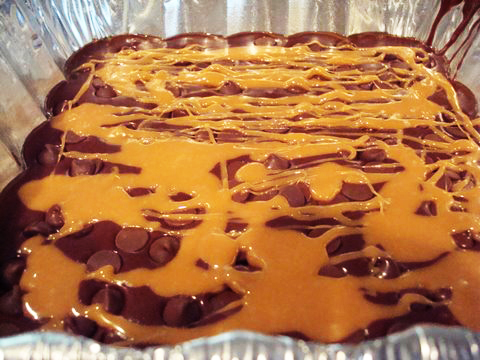 After brownies are baked pour remainder of caramel sauce on top and sprinkle with remainder chocolate chips.