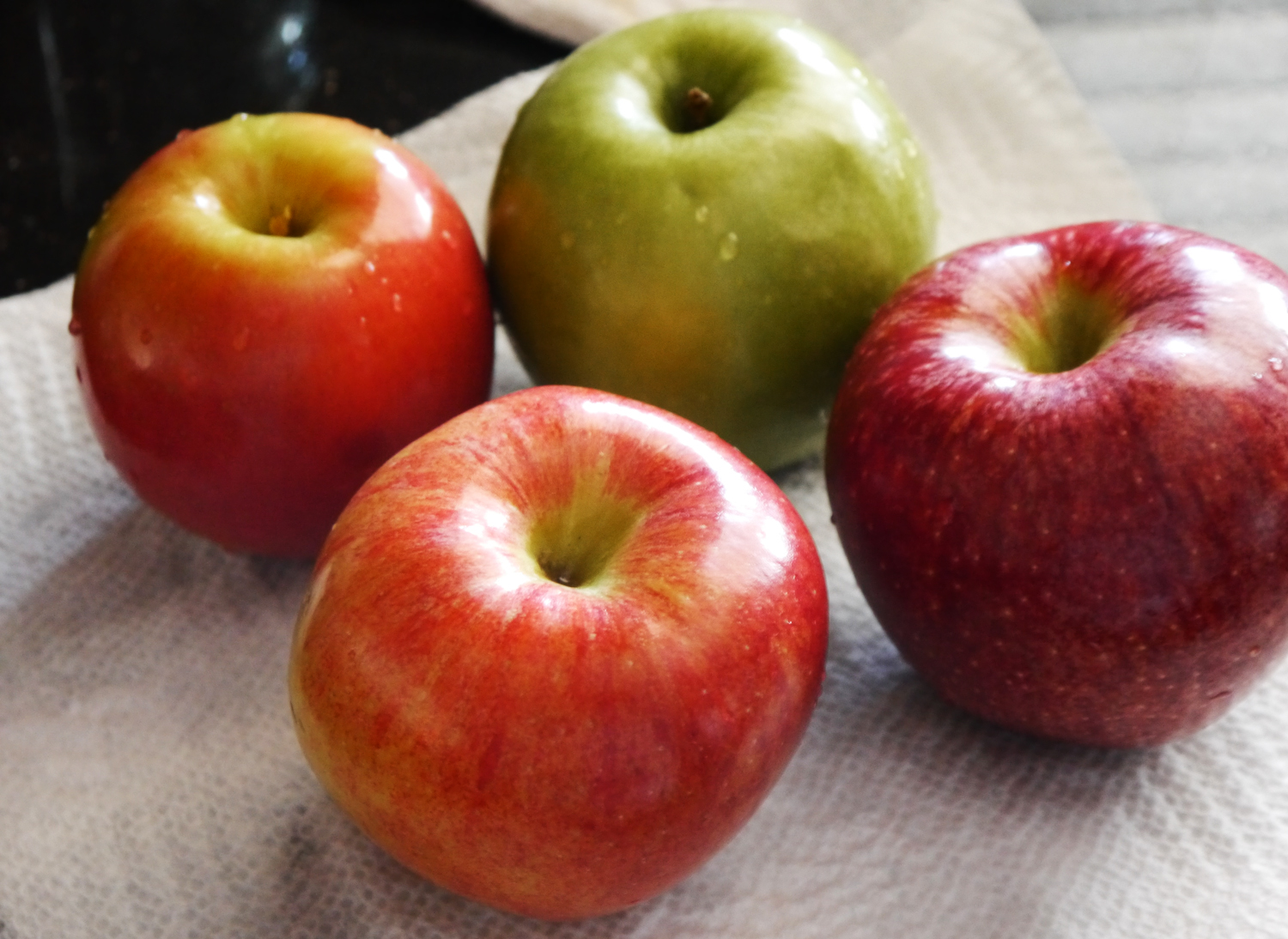 Choose which apples you like best. I choose four different kinds to play with texture and flavor. I loved all of them. Remove skin ( I used a vegetable peeler.) Slice apples about 1/4 inch thick. I just used a knife to slice out the seeds. I don’t own an apple corer or peeler so I had work with what I had and it worked just fine.