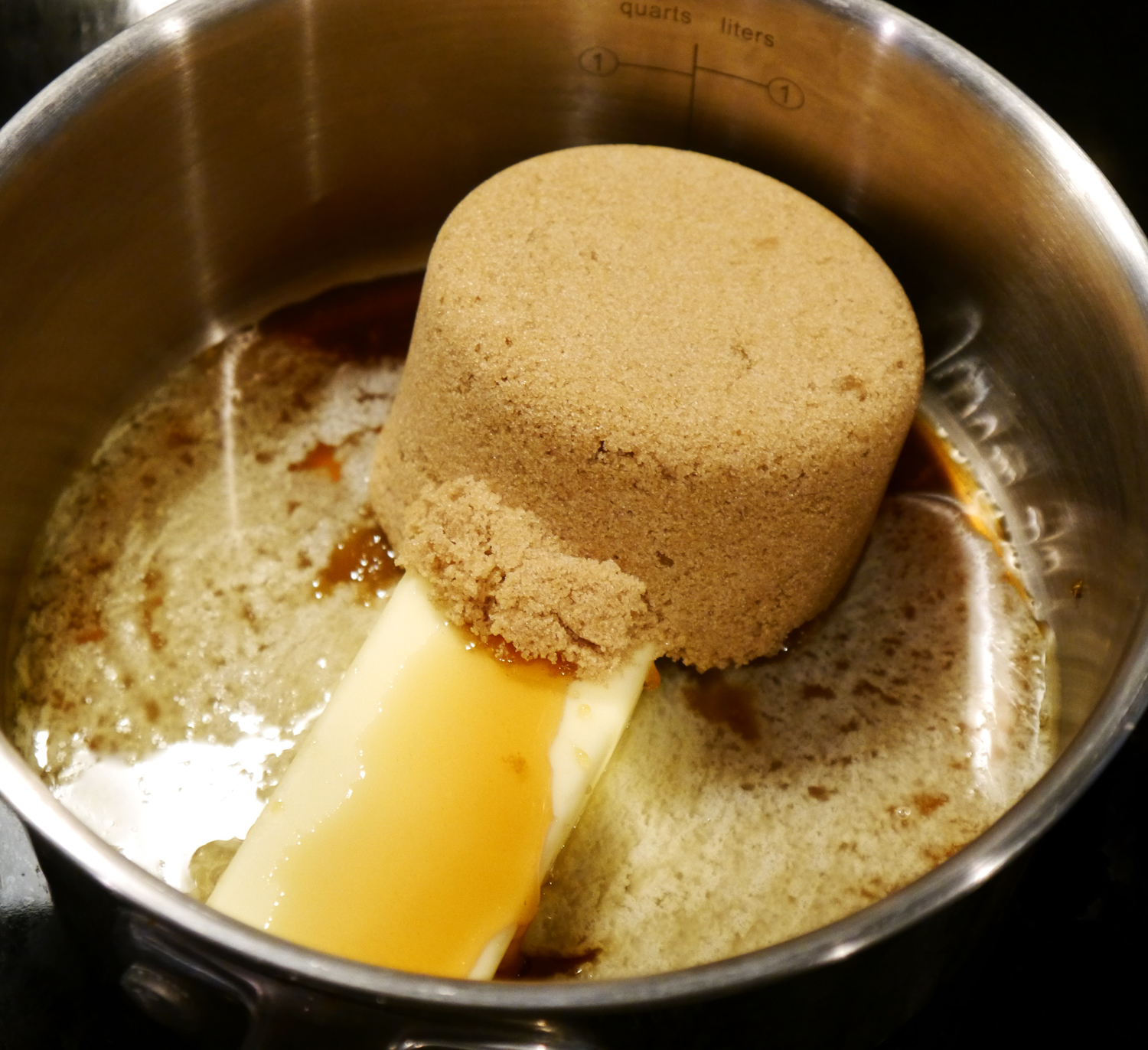 Place all ingredients in a sauce pan and warm on med-low heat until everything is melted. Stir and move to low or warm heat. Sauce will be very thin, and will thicken as it cools. Set aside.