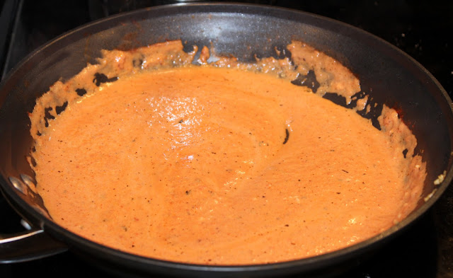 2. In a large saucepan, heat the 2 teaspoons oil with the garlic over low heat until the garlic begins to brown, about 3 minutes. Add the onion and 1/4 teaspoon salt, cover, and cook until the onion is softened, about 2 more minutes. Add the tomato, 1/2 teaspoon salt and the red pepper flakes. Bring to a simmer, reduce the heat and simmer very gently 10 minutes. Stir in the cream and evaporated milk and simmer 1 more minute.