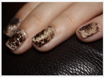 Yeah, they are charging about $150 – $300 at salons for this? That is insane to me, especially because I can’t see how it would stay on longer than a few days because of the texture. You can actually do this on your own if you know anyone that has any dead snake skin lying around. Maybe the Zoo can help you out. Or if any of your friends work at a pet store. Just do a base coat, place the skin on your nails and use some small scissors to cut it to the shape of your nail bed. Then put a thick top coat on. Easy peasy, and way cheaper than hundreds of dollars!