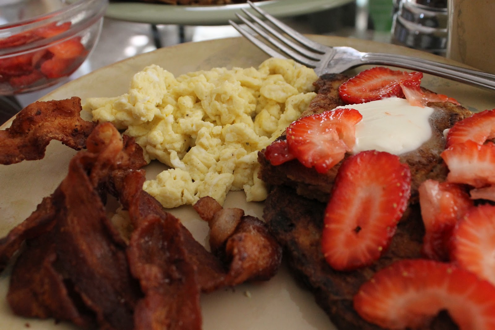 So, I thought I would share with you my Sunday brunch that my husband  and I made today for Easter. It was not anything elaborate, but we both pitched in and I thought it was delicious. I must warn you. I am not the type of woman to go all crazy with decorations, or making everything perfect. I considered making one of the amazing  dishes that I have featured on my weekly Sunday brunch, but I asked my husband what he wanted and he had a simple request. Just some eggs and bacon with maybe some french toast. “You don’t want Creme Brulee French Toast, or Raspberry Cream Cheese Stuffed French Toast?” I asked him. “Nope, just good ole’ fashion french toast – maybe with cinnamon raisin bread.” He replied. “Deal!” I said. That worked for me. Save me some time in the kitchen to give some much needed attention to my Easter mimosa.