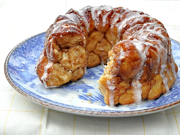 In a medium bowl whisk together confectioners sugar, milk and vanilla until smooth to form the glaze, adding a splash of additional milk if you prefer a thinner glaze. Drizzle glaze over monkey bread and serve warm.