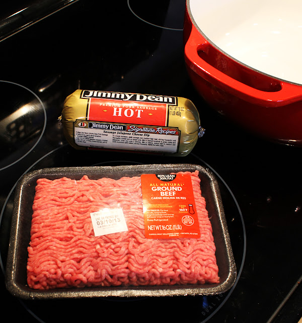 The first two ingredients are totally optional, but I chopped up two cloves of garlic with 1 tbsp of olive oil and sauteed for one minute. I added the 1-pound ground beef and 1 package of Hot Jimmy Dean sausage and cooked it on med-hot until browned.