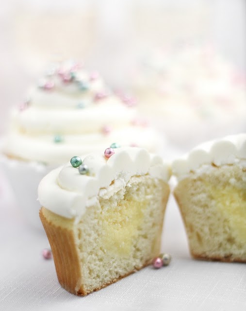 Cut a divot into the top of each cupcake and fill with pastry cream. Trim the cut-out cake pieces flat to make a “lid” and place on top of the filled divot.