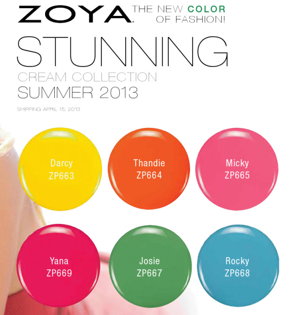 The new Summer colors for Zoya Stunning & Irresistible along with the new Zoya PixieDust are filling now and will all be available on or before April 15, 2013.